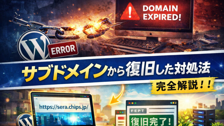 Webサイトを運営していると、いつか起こり得るトラブルがあります。それが「独自ドメインの契約切れ」。 今回は、実際に独自ドメインの有効期限切れに気づかず、サイトが閲覧不能になってしまった体験と、そこからサブドメインを使って復旧させた手順をまとめます。 同じようなトラブルで困っている方の参考になれば幸いです。 なぜドメイン切れに気づかなかったのか? 正直に言うと、更新通知メールが古いメールアドレス宛 […]